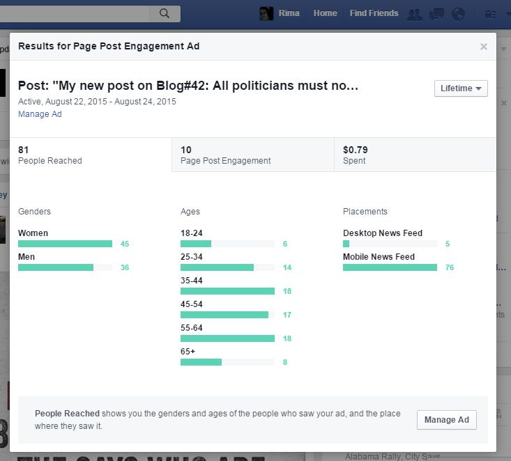 Facebook is more worthwhile for a select number of post topics. Here are some screenshots of the two posts I promoted, for $20 and $10 respectively: