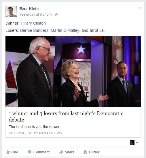 -67% of voters think Clinton won the debate, to 20% for Bernie Sanders and 7% for Martin O’Malley. On a related note 63% of viewers said the debate gave them a more positive opinion of Clinton, compared to 41% who said it gave them a more positive opinion of Sanders, and 37% who said it gave them a more positive opinion of O’Malley.