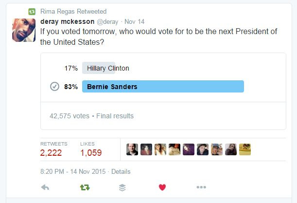 Read the rest of PPP's poll data here. The Huffington Post's Brian Hanley has a full round up of all the online polls. While online polls are deemed to be less reliable than traditional polls, one has to take the PPP data with several grains of salt. The press has been full of articles criticizing Hillary Clinton for several gaffes during the debate, including the New York Times on her answers on Wall Street money. I guess the blunders were too obvious to gloss over, this time. This brings me to another point that the mainstream media has been reinforcing at every possible turn: that Hillary Clinton has the Black vote all sewn up. But does she? Black Lives Matter activist Deray McKesson ran his own online poll: